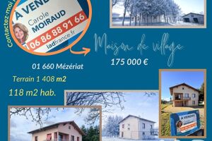 Iad France - Carole Moiraud vous propose : Belle opportunité à Mézériat – Le charme de l'ancien : Maison 118 m² sur terrain spacieux ! Envie d'espace et de potentiel à deux pas de tout ? À 10 minutes à pied du cOEur de Mézériat et de la gare, découvrez cette maison de village qui a tout d'une grande. Posée sur un terrain exceptionnel de 1408 m², elle offre la proximité de la campagne avec les commodités de la ville. Ses atouts majeurs : - Les volumes : 118 m² habitables avec une belle hauteur sous plafond. - La tranquillité d'esprit : Toiture refaite et isolée en 2019 (un gros budget en moins pour vous ! ). L'extérieur : Un jardin rare sur le secteur et un grand balcon accessible depuis le séjour pour vos cafés au soleil. À l'intérieur : L'étage est dédié à la convivialité avec une cuisine ouverte sur un vaste salon / salle à manger, baigné de lumière. L'espace nuit comprend 3 grandes chambres (dont une au RDC pour plus d'indépendance) et une salle d'eau. Le rez-de-chaussée offre également un grand hall, une buanderie pratique et un garage attenant. Le Bonus : Une dépendance de 34 m² dans le jardin. Atelier, stockage ou future cuisine d'été ? À vous d'imaginer ! Un projet malin : Des fenêtres en bois aux beaux volumes, cette maison est habitable de suite mais offre un potentiel incroyable de rénovation. Elle est éligible aux aides de l'État (MaPrimeRénov’, CEE). Vous rénovez à votre goût tout en étant financé : le combo gagnant ! En résumé : - 3 chambres spacieuses - Cuisine ouverte sur salle à manger et salon - Belle hauteur sous plafond offrant de beaux volumes - Fenêtres bois et persienne métalliques. - Façade refaite en 1990 - 2019 - Réfection de la toiture avec changement des tuiles et ajout d’un film de protection avec isolation du grenier avec de la laine projetée soufflée. - Chauffage Gaz (chaudière Saunier Duval) ( gaz de ville) - Assainissent collectif (tout à l’égout) Emplacement idéal : Située à seulement 10 minutes du centre de Mézériat, la maison bénéficie d'un accès facile aux transports avec la gare à proximité, facilitant les déplacements vers les lycées et autres commodités. Ne laissez pas passer cette opportunité unique d'acquérir une maison de village avec de beaux volumes et un cadre de vie agréable. Un renseignement, une visite. Contactez-moi vite ! Honoraires d'agence à la charge du vendeur. Information d'affichage énergétique sur ce bien : classe ENERGIE E indice 302 et classe CLIMAT E indice 56. Les informations sur les risques auxquels ce bien est exposé, y compris l'obligation légale de débroussaillement, sont disponibles sur le site Géorisques : http://www.georisques.gouv.fr. La présente annonce immobilière a été rédigée sous la responsabilité éditoriale de Mme Carole Moiraud mandataire indépendant en immobilier (sans détention de fonds), agent commercial de la SAS I@D France immatriculé au RSAC de BOURG-EN-BRESSE sous le numéro 902754969, titulaire de la carte de démarchage immobilier pour le compte de la société I@D France SAS.