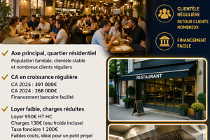 Iad France - Yongcheng Zhan vous propose : Restaurant à vendre 77 Pontault-Combault - CA stable - loyer bas - clientèle fidèle ⭐️ Axe principal, quartier résidentiel familial, clientèle régulière ⭐️ CA 2025 : 391 000€, 2024 : 268 000€, croissance stable ⭐️ Loyer 950€ HT HC, charges 138€ (eau froide incluse), taxe foncière 1 200€, faibles coûts ⭐️ Surface environ 41 m², extraction 400 mm, conduit rénové et entretenu tous les 2 mois ⭐️ Vitrine sur rue, bonne visibilité ⭐️ Parking facile Prix : 112 000€ (honoraires inclus) Honoraires d'agence à la charge du vendeur. Bien non soumis au DPE. Les informations sur les risques auxquels ce bien est exposé, y compris l'obligation légale de débroussaillement, sont disponibles sur le site Géorisques : http://www.georisques.gouv.fr. La présente annonce immobilière a été rédigée sous la responsabilité éditoriale de M Yongcheng Zhan mandataire indépendant en immobilier (sans détention de fonds), agent commercial de la SAS I@D France immatriculé au RSAC de BOBIGNY sous le numéro 925068140, titulaire de la carte de démarchage immobilier pour le compte de la société I@D France SAS.
