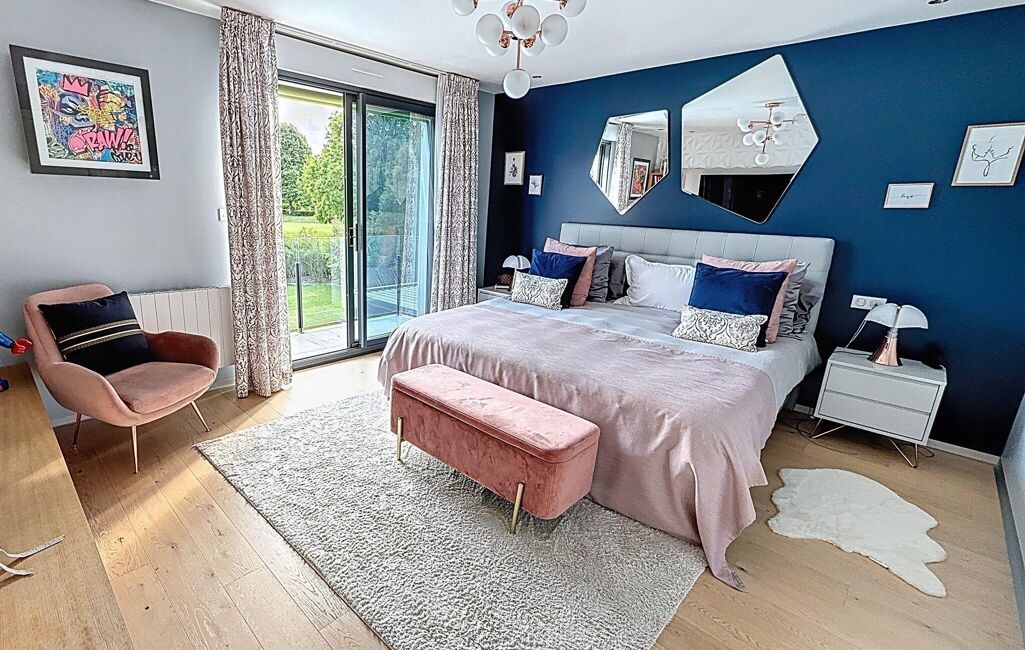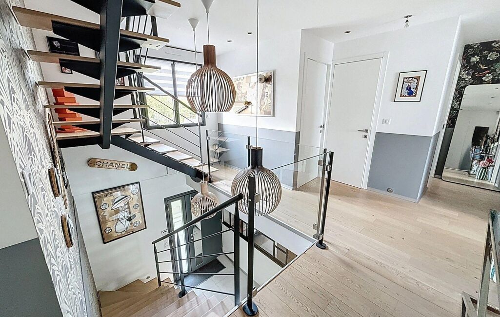 Dès l'entrée, vous serez séduits par le hall cathédrale qui donne le ton de cette maison raffinée. Le vaste séjour double de 63 m², baigné de lumière grâce à de larges baies vitrées, est agrémenté d'une cheminée à insert et s'ouvre harmonieusement sur le jardin. La cuisine aménagée et équipée, spacieuse et fonctionnelle, séduira les amateurs de gastronomie. Un bureau avec rangement sur mesure vous permettra de travailler en toute sérénité. Pour compléter ce niveau, vous trouverez un dressing sur toute la longueur du couloir, une buanderie, un WC indépendant ainsi qu'un double garage avec porte automatique et accès direct à la maison.