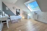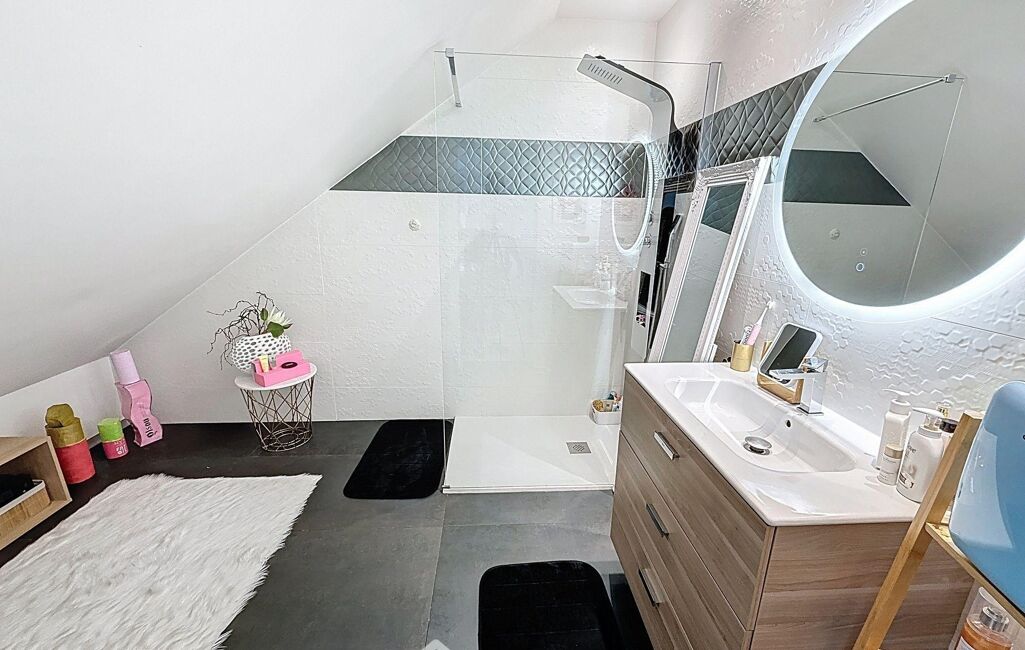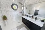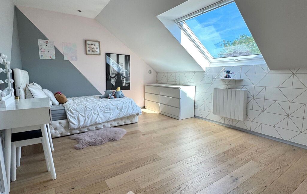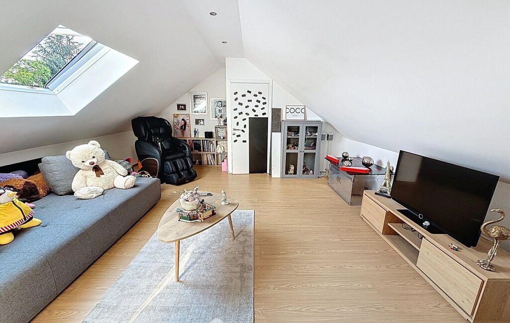 À l'étage, un grand palier dessert l'espace nuit. Deux chambres avec rangements intégrés, une élégante salle d'eau avec double vasque et un WC indépendant y prennent place. La suite parentale, véritable havre de paix, dispose d'un balcon privé, d'un vaste dressing déjà aménagé et d'une salle de bains d'exception avec douche, baignoire balnéo, double vasque, bidet et WC. Une chambre supplémentaire, dotée de son propre espace salle d'eau, complète ce niveau. Les combles aménagés offrent un espace supplémentaire, idéal pour une salle de jeux, un home cinéma ou une chambre d'amis.