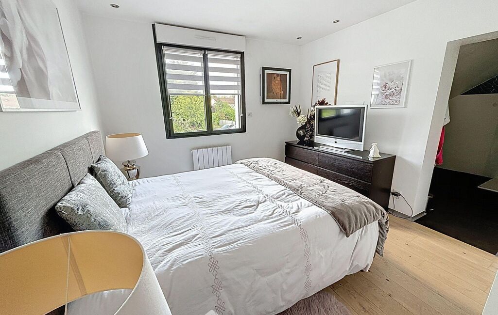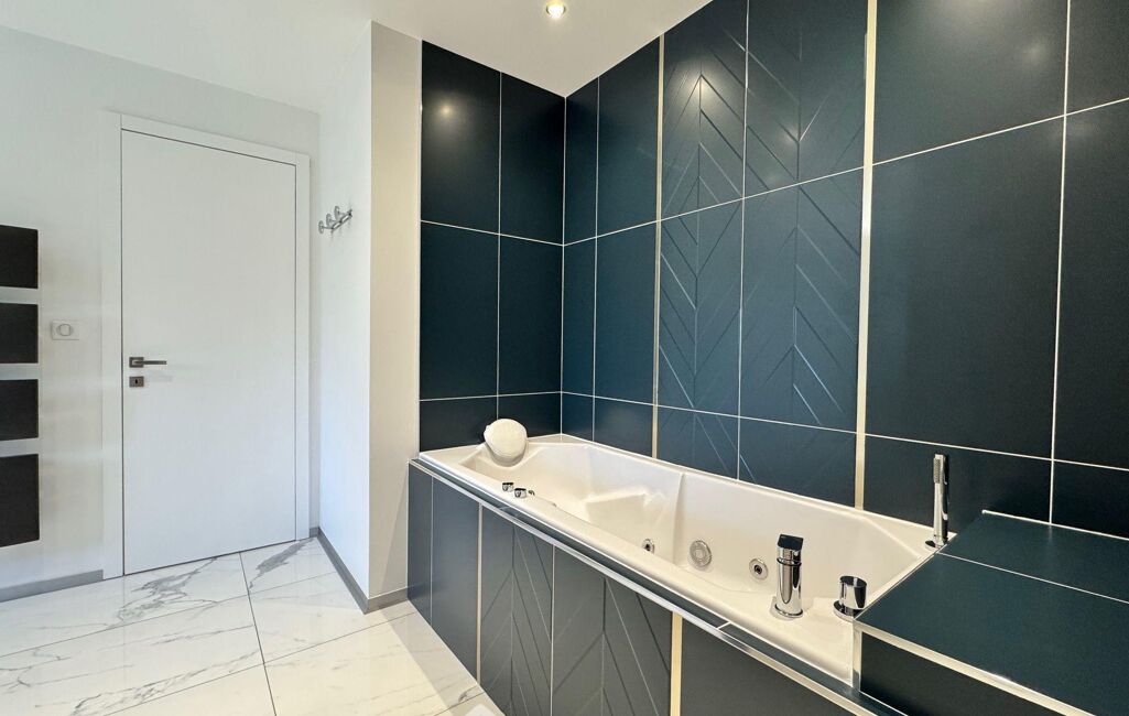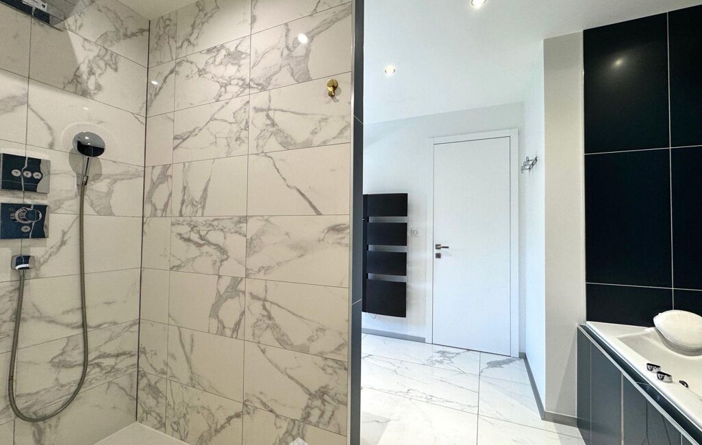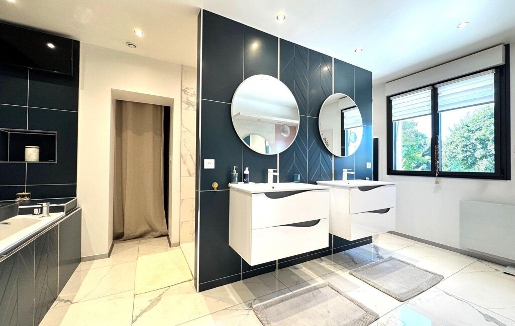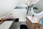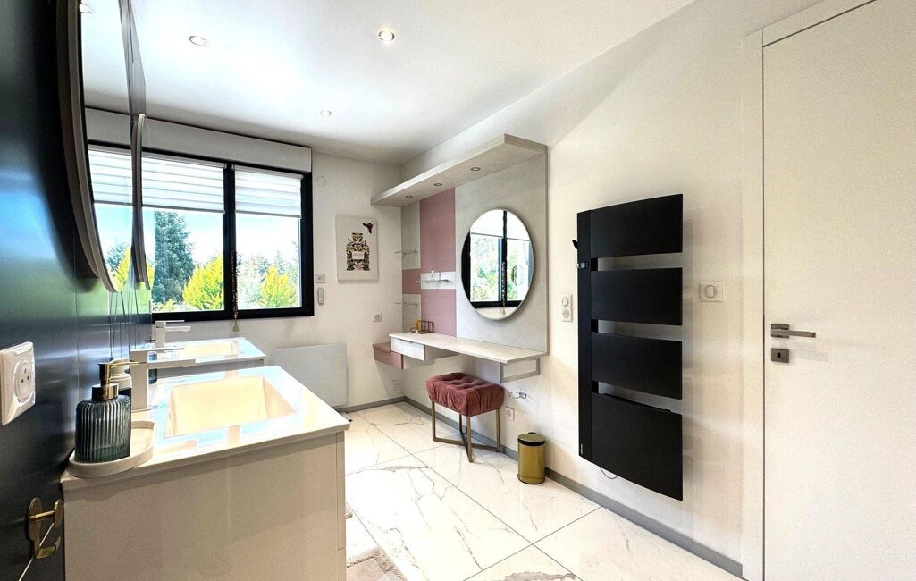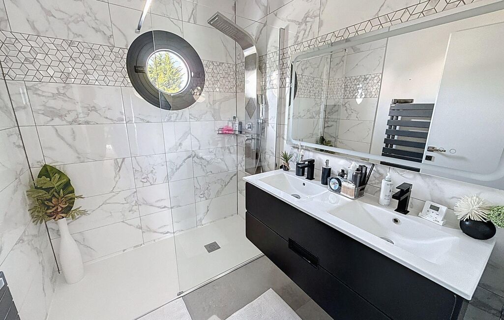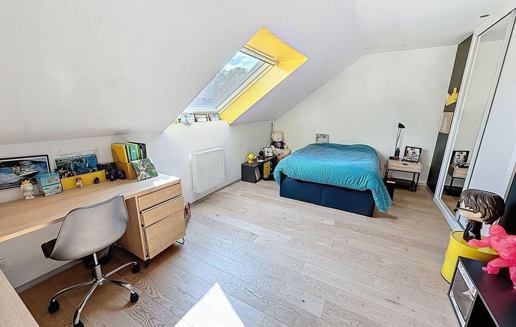 À l'étage, un grand palier dessert l'espace nuit. Deux chambres avec rangements intégrés, une élégante salle d'eau avec double vasque et un WC indépendant y prennent place. La suite parentale, véritable havre de paix, dispose d'un balcon privé, d'un vaste dressing déjà aménagé et d'une salle de bains d'exception avec douche, baignoire balnéo, double vasque, bidet et WC. Une chambre supplémentaire, dotée de son propre espace salle d'eau, complète ce niveau. Les combles aménagés offrent un espace supplémentaire, idéal pour une salle de jeux, un home cinéma ou une chambre d'amis.