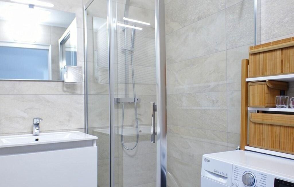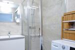 La salle d'eau moderne, avec douche à l'italienne, sèche-serviettes, espace buanderie intégré et toilettes séparées, offre confort et praticité au quotidien.