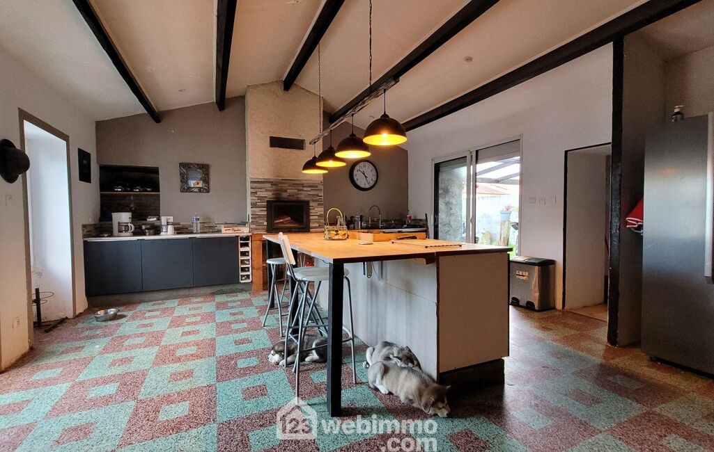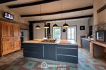 Grande cuisine aménagée avec cheminée insert et sa baie vitrée ouvrant sur la terrasse couverte