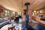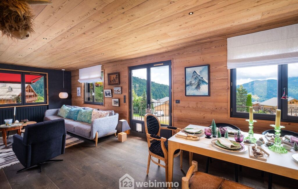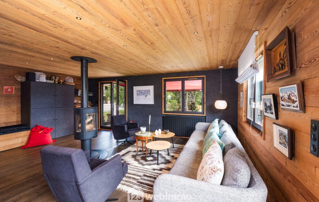 Le séjour, baigné de lumière, s'ouvre sur un panorama sur le Mont Charvin. Son poêle à bois tournant crée une atmosphère chaleureuse et conviviale, idéale après une journée en montagne.