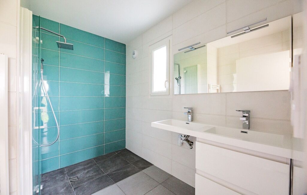 Le logement se compose au rez-de-chaussée d’une entrée avec rangements, d’une cuisine aménagée ouverte sur un vaste séjour lumineux, d’une chambre parentale avec salle d’eau, d’un cellier et de WC séparés.