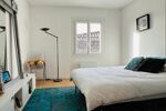 À l'étage : un palier dessert deux chambres lumineuses, dont une avec un aperçu sur le port, et une salle d'eau.