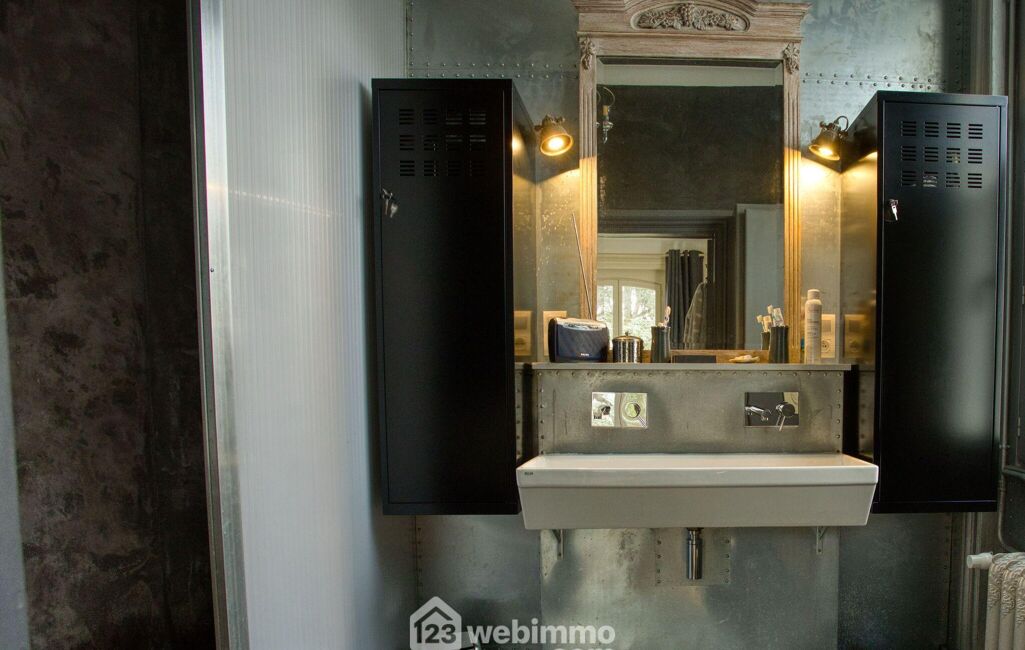 L'escalier mène au premier niveau, dédié à l'espace nuit principal. On y trouve deux chambres séparées par une salle d'eau commune, pensée comme un espace partagé, avec deux vasques et une douche centrale. Ce niveau accueille également une véritable suite parentale avec sa salle d'eau privative et un grand dressing de 13 m², aménagé comme une pièce à part entière.