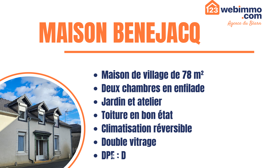 Votre agence 123webimmo l'immobilier au meilleur prix vous présente : Située au cœur de Bénéjacq, cette maison de village de 78 m² habitables est implantée sur une parcelle de 173 m² et offre un extérieur agréable ainsi qu'un atelier indépendant.