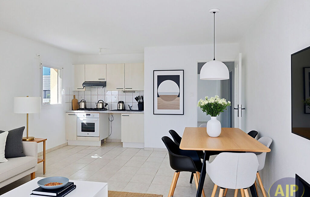 Entée avec placard, un grand salon séjour donnant sur une terrasse avec jardinet sans vis à vis exposée SUD-OUEST Petite cuisine aménagée et équipée , 2 chambres, salle de bain et wc séparé.