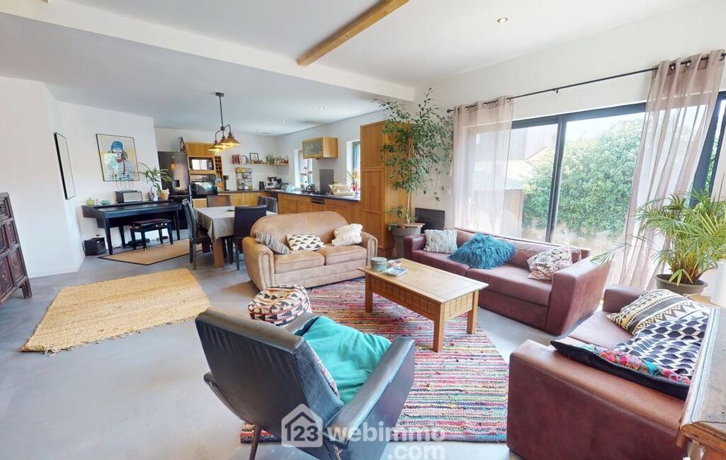Une belle pièce de vie traversante de près de 45 m², lumineuse, avec cuisine ouverte ;
