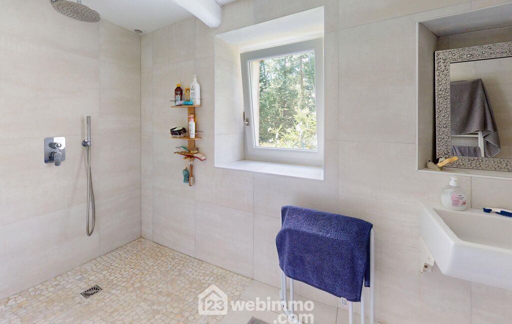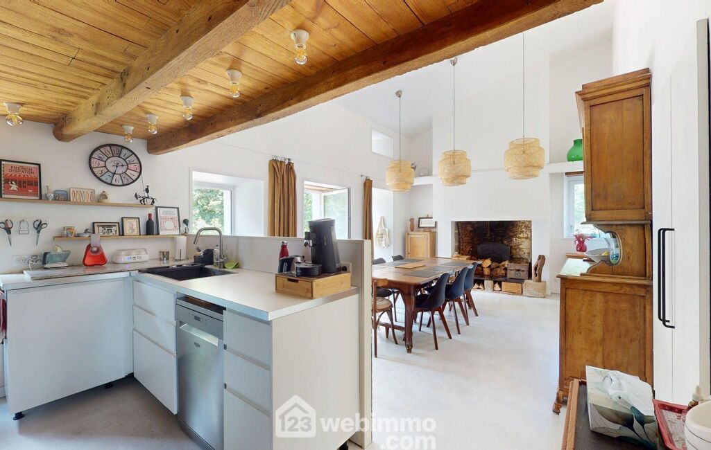 Le bâtiment principal développe 286 m² habitables. Au rez-de-chaussée, une entrée distribue une vaste pièce de 43 m² en parquet massif actuellement utilisée en chambre et bureau, un salon avec cheminée insert, ainsi qu'une superbe pièce de vie de 35 m² où une cuisine ouverte et une salle à manger conviviale se déploient sous une belle hauteur, autour d'une imposante cheminée à foyer ouvert. Sol en béton ciré, plancher chauffant et ouvertures vers la terrasse renforcent le confort et la modernité de cet espace. Une arrière-cuisine, une salle d'eau avec douche à l'italienne et une chambre avec accès au jardin complètent ce niveau.