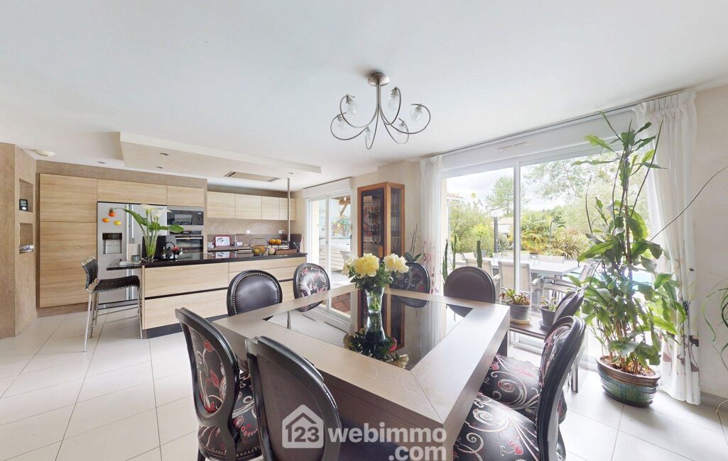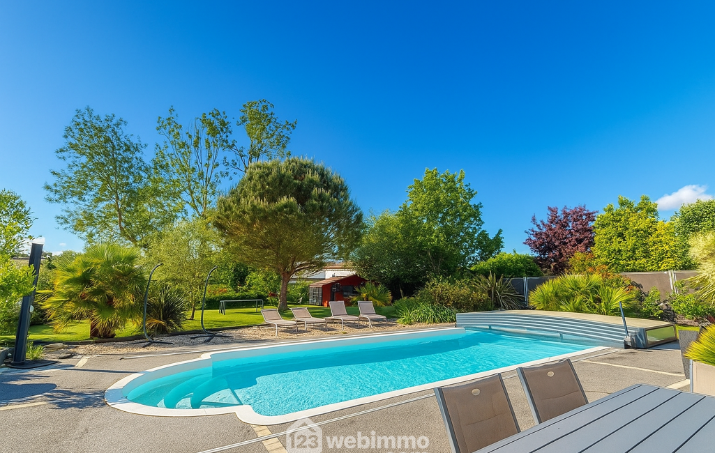 Depuis le séjour, vous profitez d'une vue dégagée sur le jardin soigneusement paysagé et la magnifique piscine chauffée de 10x4,5 m, couverte par un dôme amovible, parfaite pour des baignades toute l'année.