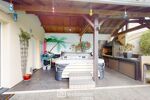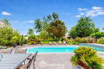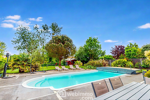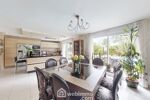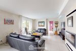 Depuis le séjour, vous profitez d'une vue dégagée sur le jardin soigneusement paysagé et la magnifique piscine chauffée de 10x4,5 m, couverte par un dôme amovible, parfaite pour des baignades toute l'année.
