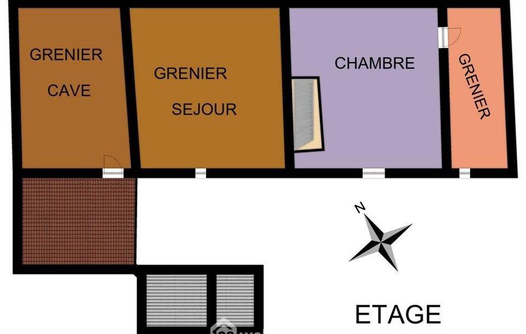 Répartie sur 2 niveaux, elle comprend au rez-de-chaussée entrée, 2 pièces de 34 et 41 m2, salle d'eau. A l'étage, grenier aménageable de 34 m2 et 2 pièces de 20 et 9 m2.