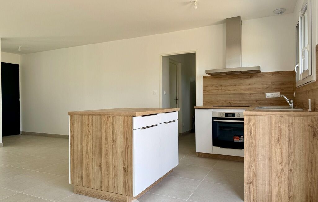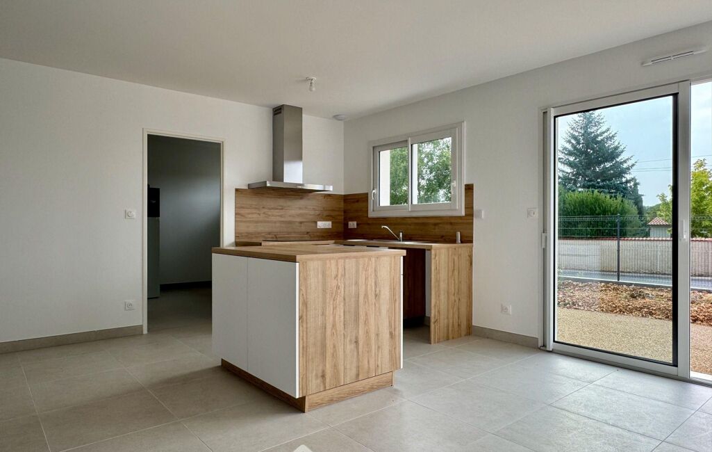 Entrée, grande pièce de vie avec cuisine aménagée et équipée, ouverte sur salon et salle à manger, 3 chambres, salle d'eau / WC, WC indépendant avec lave-mains, cellier-buanderie et garage isolé et carrelé.