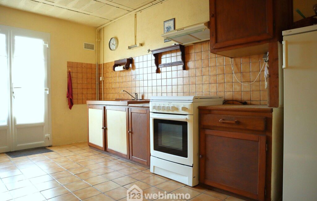 Maison familiale comprenant : entrée avec placard, cuisine indépendante aménagée/équipée, séjour traversant avec cheminée-insert, dégagement, 3 chambres, salle de bain et WC indépendant.