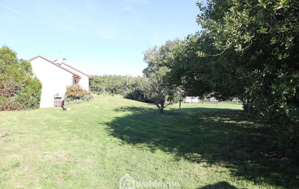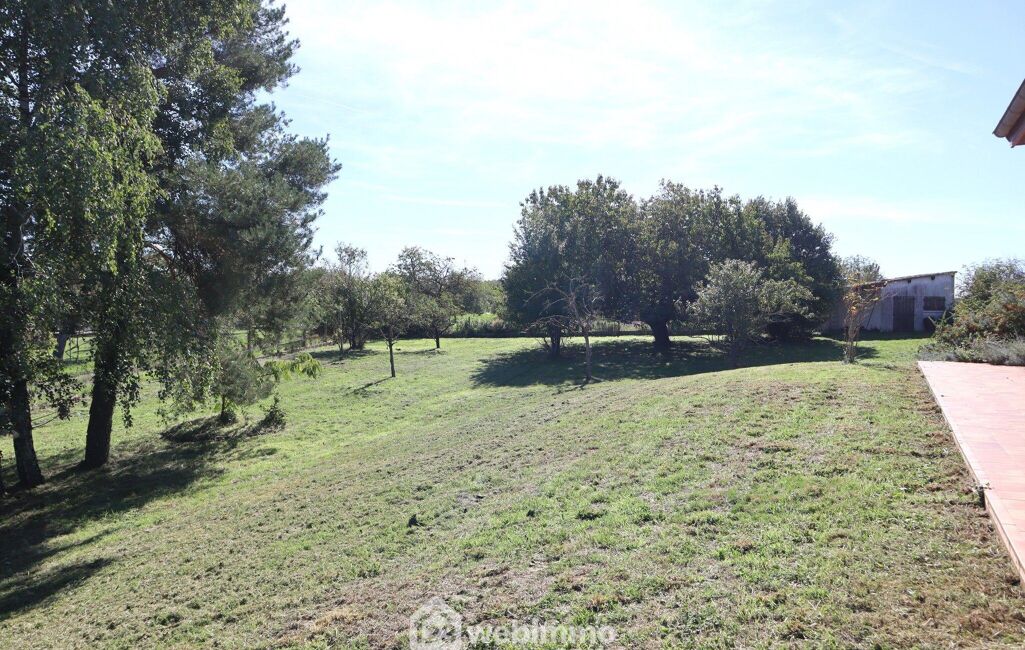 Terrain clos, arboré, avec arbres fruitiers et dépendance de jardin avec carport.