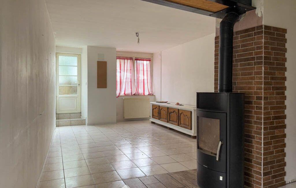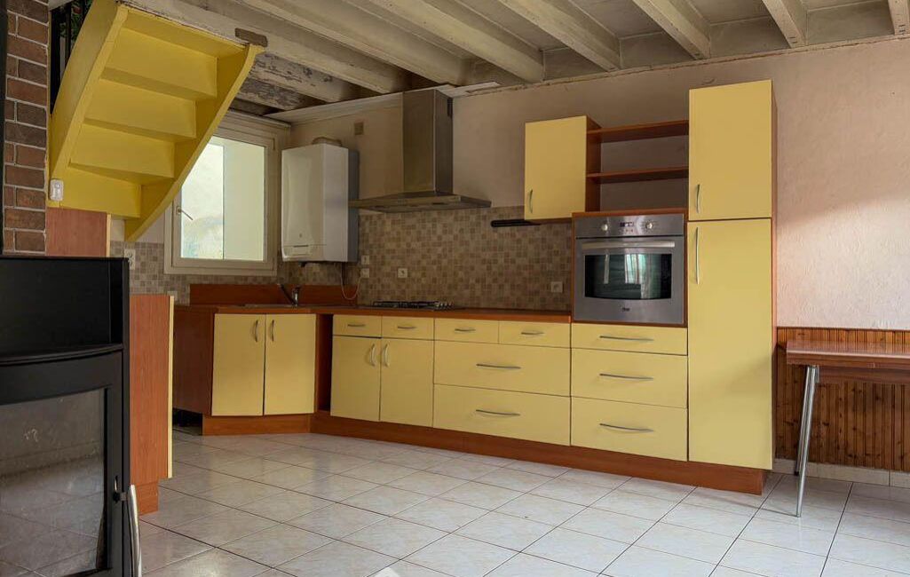 La pièce de vie de 21 m² s'ouvre sur une cuisine équipée (hotte, plaque gaz, four) autour d'un poêle à bois installé en 2023, parfait pour créer une ambiance chaleureuse.