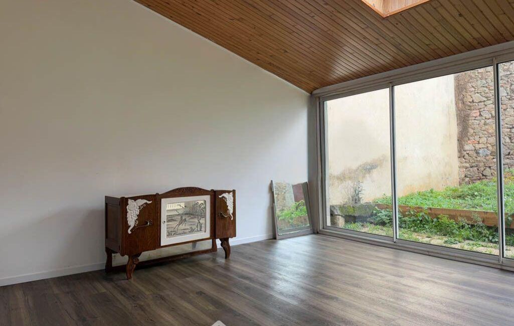 Quelques marches mènent à un salon lumineux de 15 m², ouvert sur un jardin clos de murs en pierre, intime et sans vis-à-vis.