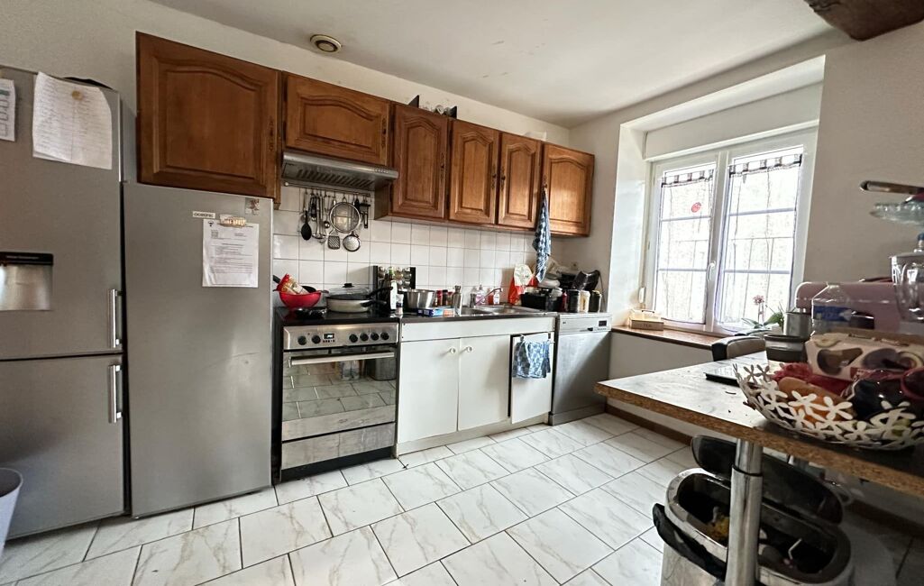 Maison n°2 (111 m² habitables), louée actuellement 475 €/mois, comprend un séjour ouvert sur la cuisine, trois chambres, salle de bains, WC et une cave.