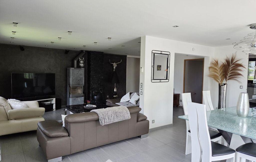 A l'étage, sa lumineuse et spacieuse pièce de vie de 64m² offre un grand salon avec un poêle à bois et une climatisation réversible, une belle cuisine ouverte et une salle à manger. Cette espace convivial donne accès à une large terrasse avec une vue dégagée sur les montagnes, et à une piscine qui sera très appréciée lors de la saison estivale.