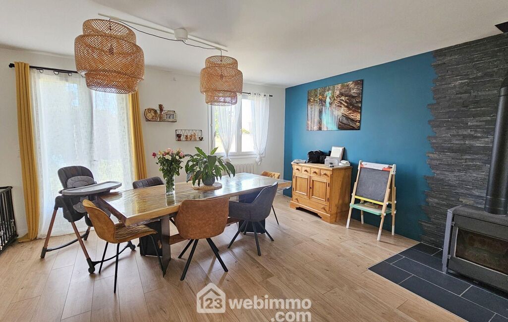 Dès l'entrée, vous découvrez un spacieux séjour de 40 m², lumineux et chaleureux grâce à son poêle à bois, créant un véritable cœur de vie. La cuisine équipée, pratique et conviviale, est complétée par un cellier, apportant un espace de rangement appréciable au quotidien.