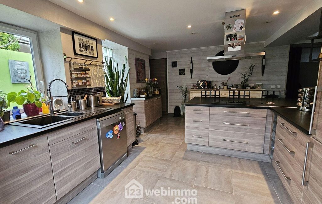Dès les premiers pas, les volumes et la luminosité interpellent. Le séjour cathédrale, véritable cœur de la maison, met en valeur les pierres apparentes et s'articule autour d'un poêle à bois, créant une ambiance chaleureuse et conviviale. La cuisine ouverte, entièrement équipée, offre un espace fonctionnel et accueillant, idéal pour les moments de partage.
