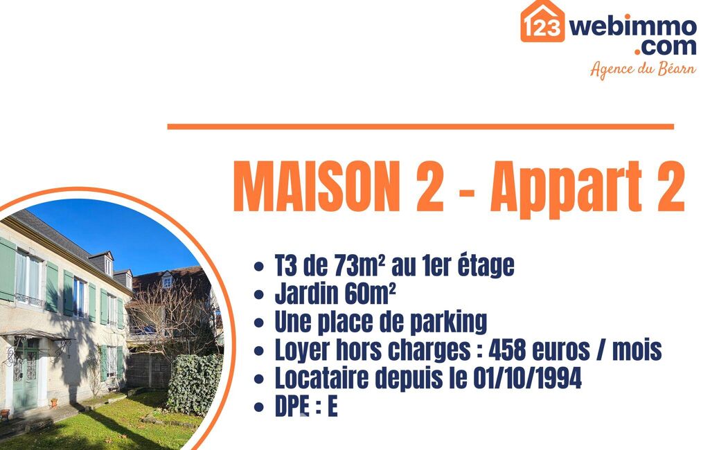 - Un appartement T3 de 72 m² au premier étage, avec jardin, balcon et place de stationnement.