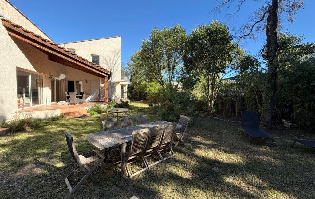Habitation familiale avec un vaste séjour lumineux, une cuisine équipée, 4 grandes chambres, 1 bureau, 1 bibliothèque, 2 salles de bains, cellier, buanderie, un patio et un jardin paysagé de 1000 m².