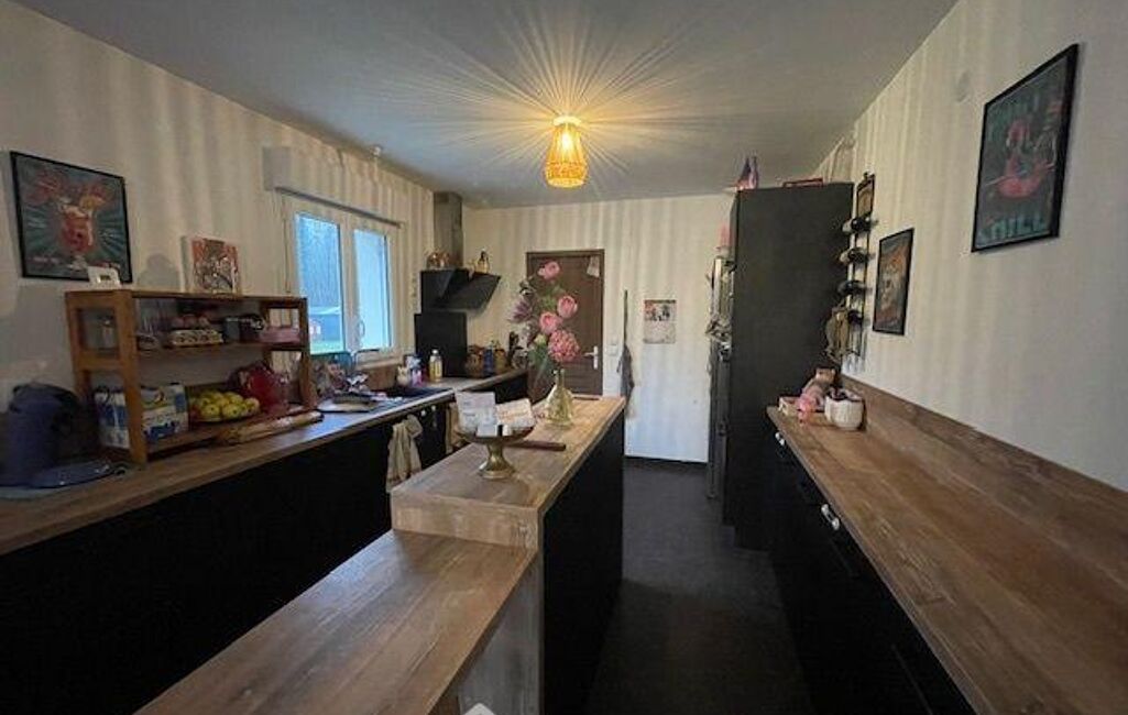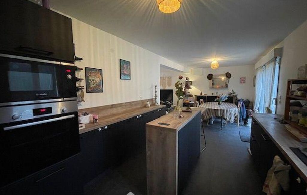 - Au rez-de-chaussée : Séjour/salon de plus de 30 m² (conduit existant pour l'installation d'un poêle à pellets), cuisine aménagée et équipée de marque 'CUISINELLA' (2022) ouverte, dégagement, une première chambre avec grande douche à l'italienne, wc indépendant, buanderie/cellier.