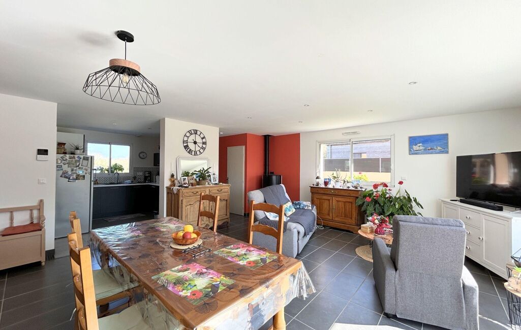 La maison se compose d'une entrée de 4m2 avec espace de rangement, un cuisine Cuisinella aménagée et équipée de 9m2 avec son arrière cuisine de 6m2, un salon/séjour de 35m2 avec une grande baie vitrée à galandage, orienté Sud-Ouest, gorgé de lumière ouvert sur une terrasse de 45m2 environ, d'une suite parentale de 13m2 avec douche, ouverte sur la terrasse au sud.