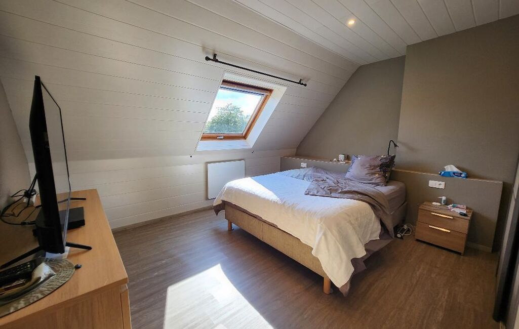 Côté confort, la maison est équipée de panneaux photovoltaïques et d'un poêle à granulés, garantissant chaleur et économies d'énergie.