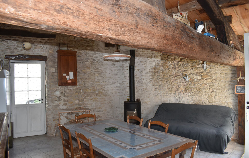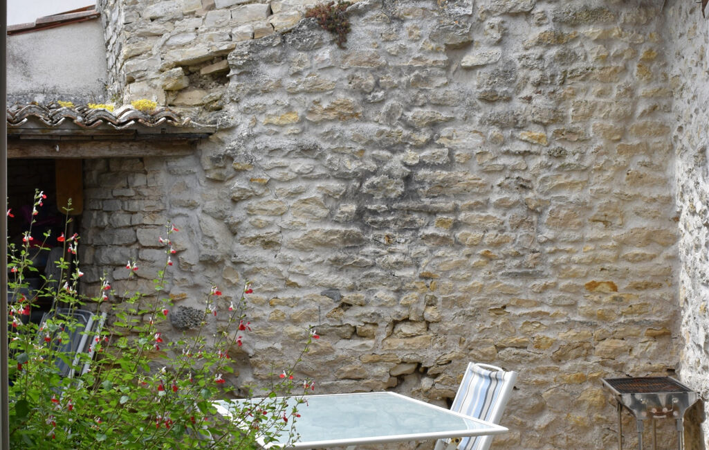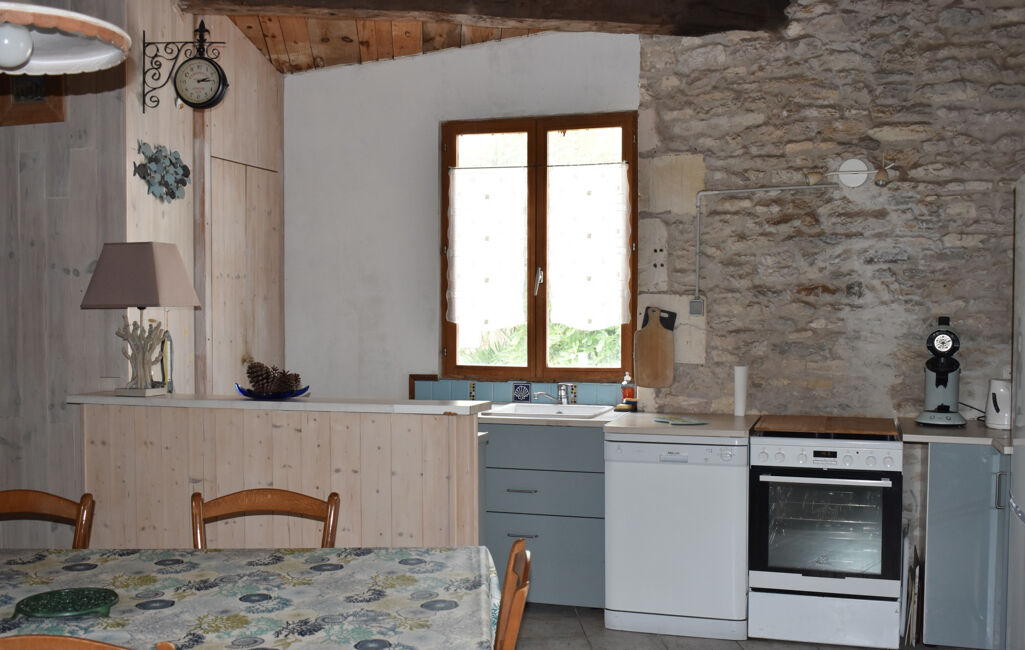 Maison ancienne de plain-pied comprenant une pièce de vie avec poêle à bois, cuisine ouverte, deux chambres, salle d'eau avec wc. Cour ensoleillée.