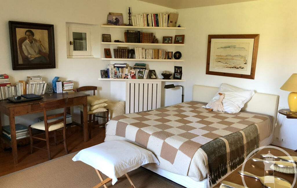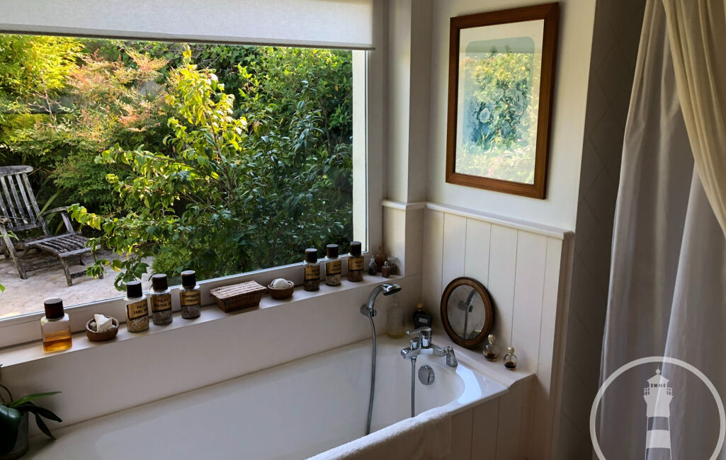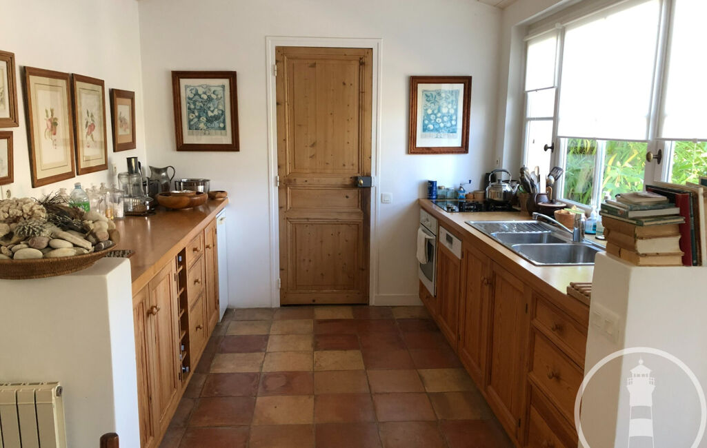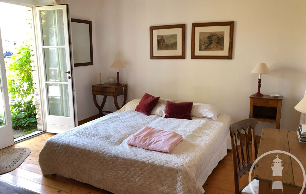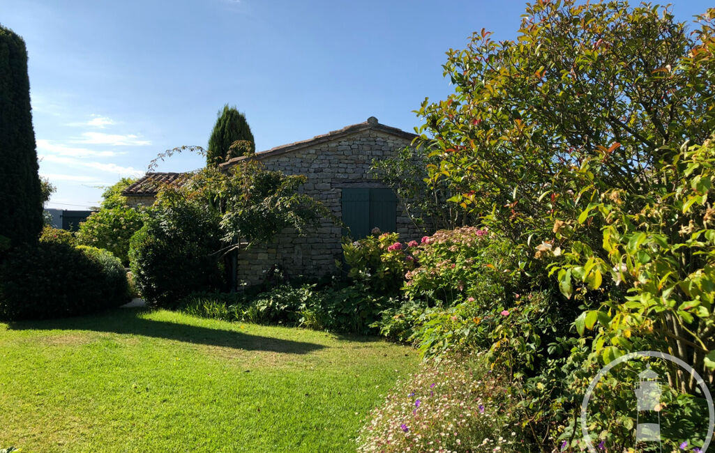 Deux corps de bâtiments la composent ; la partie principale comprend un large salon ouvert sur le jardin, une cuisine ouverte, buanderie et garage. On y trouve également une suite parentale avec wc, dressing et une belle salle de bains donnant sur un patio.