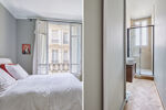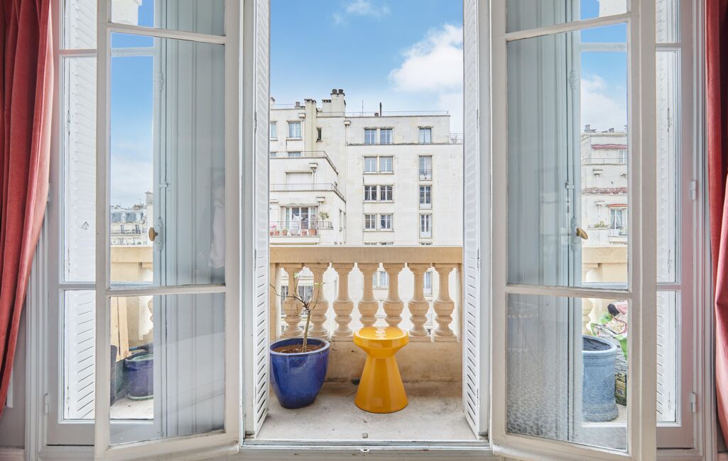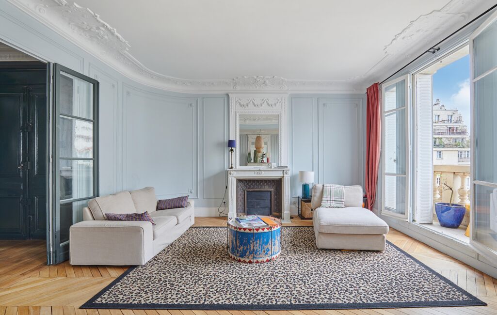 Au 5ᵉ étage d'un immeuble ancien de 1913 parfaitement entretenu avec ascenseur et gardienne à demeure, ce bien familial s'ouvre sur une entrée élégante menant à un vaste double séjour de 42m2 baigné de lumière grâce à son exposition Ouest, prolongé par un balcon offrant une vue dégagée.
