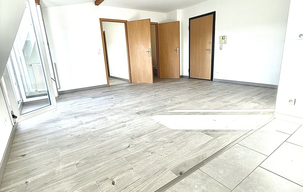 Cuisine carrelée ( à personnaliser ) ouverte sur salon parquet, surface de l'ensemble environ 26 m², accès balcon