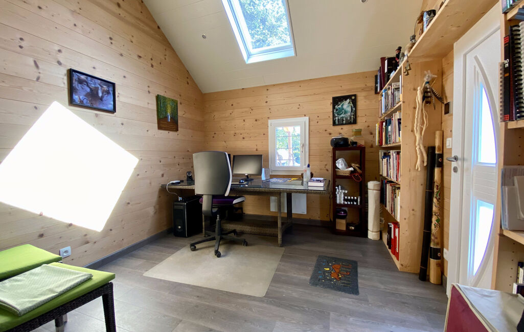 On bénéficie également d’une cave, d’espaces de rangements, d’un garage double avec porte motorisée, d’une grande pièce de stockage extérieure et d'une annexe indépendante aménagée, lumineuse, avec accès à la terrasse, pouvant servir de grande chambre d’appoint ou de bureau.