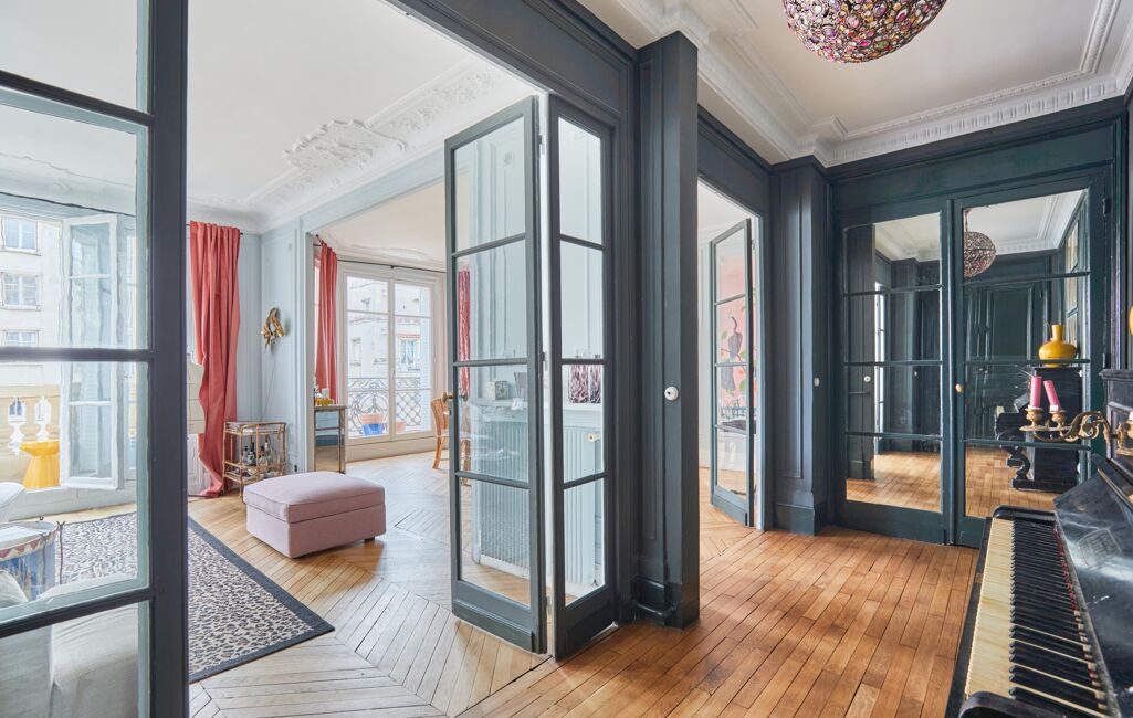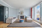 Au 5ᵉ étage d'un immeuble ancien de 1913 parfaitement entretenu avec ascenseur et gardienne à demeure, ce bien familial s'ouvre sur une entrée élégante menant à un vaste double séjour de 42m2 baigné de lumière grâce à son exposition Ouest, prolongé par un balcon offrant une vue dégagée.