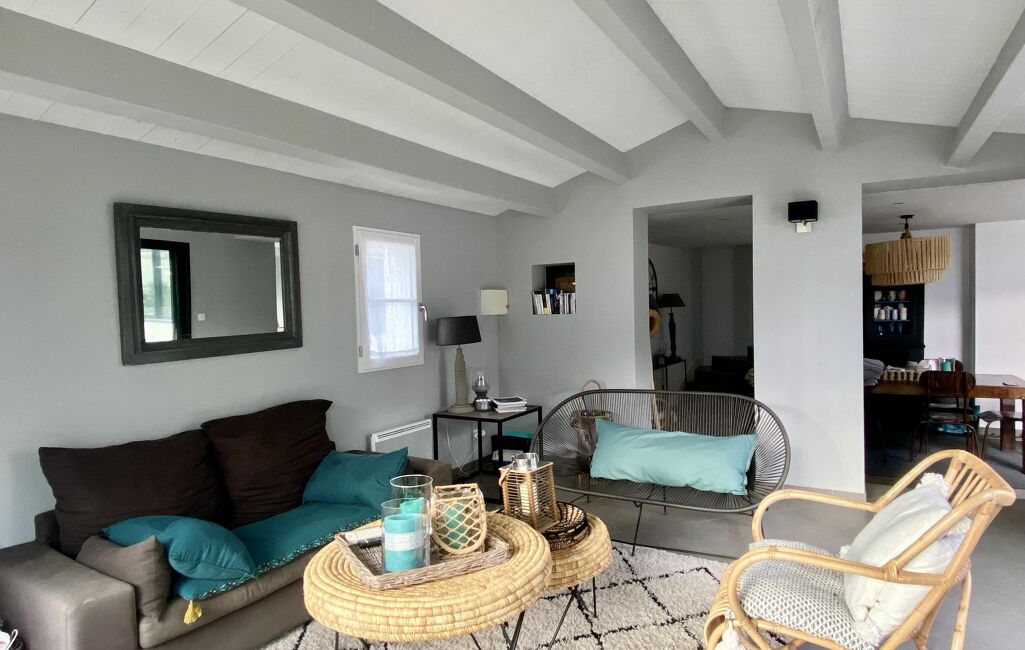 Maison Loix 110 m², au rdc séjour avec cuisine ouverte, salon, WC séparé, buanderie. A l’étage 3 chambres dont une avec sa sde, une 2ème sde et un WC séparé. Dans le jardin, une grande chambre indépendante avec sa sde et son WC. Cave. Jardin clos de murs, terrasse. Atelier.