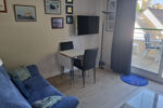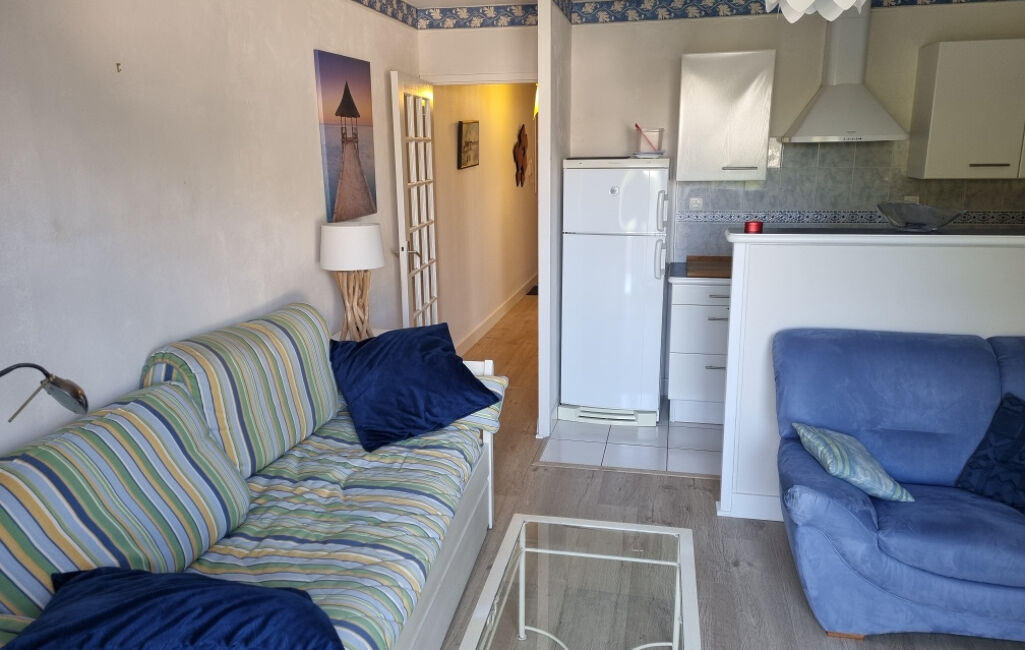 T2 dernier étage sans ascenseur à 350m de la mer comprenant entrée avec placard. Salon séjour ouvert sur cuisine aménagée et équipée.