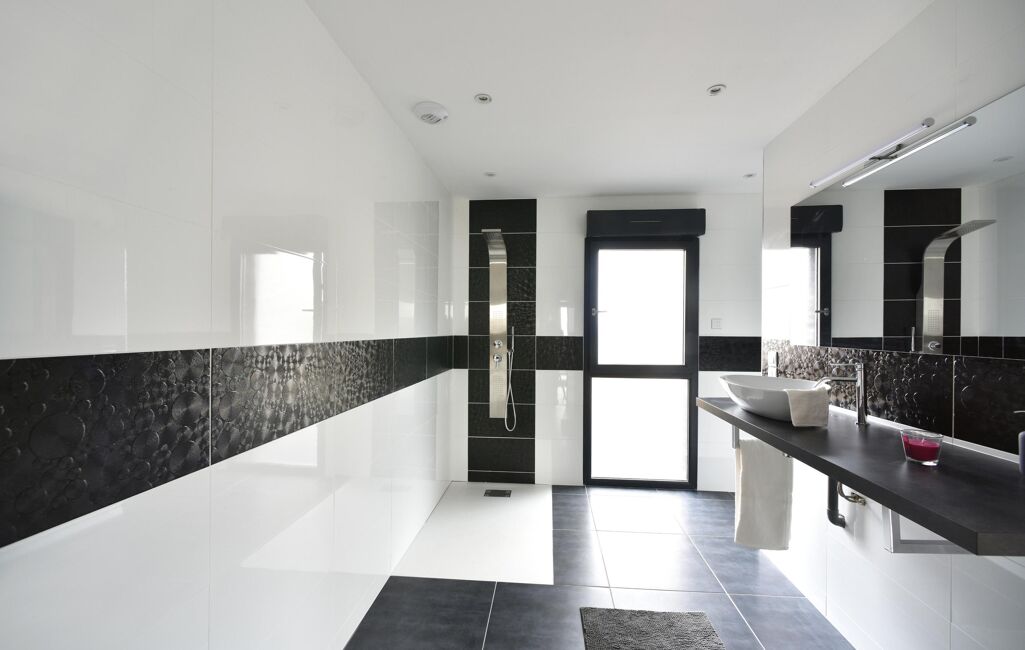Grande salle de bain avec meuble double vasque avec douche ou baignoire.