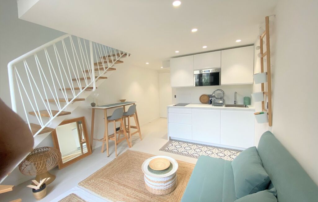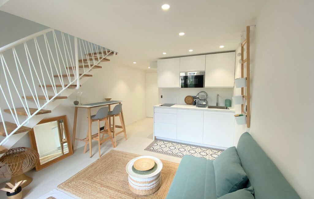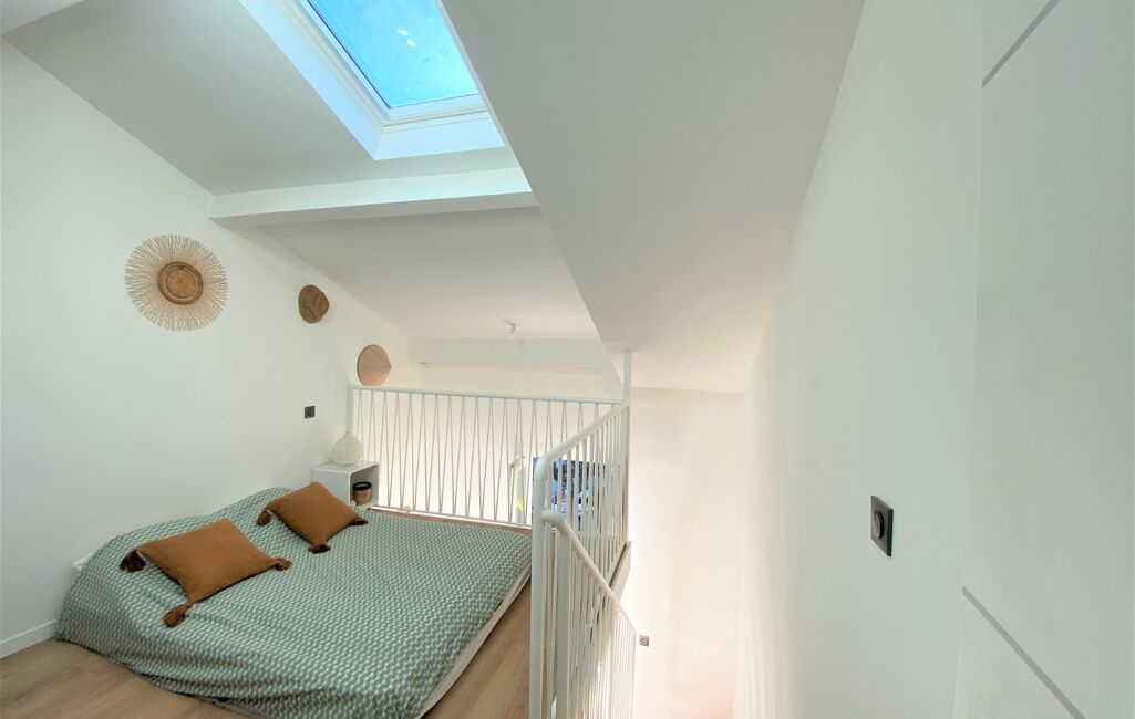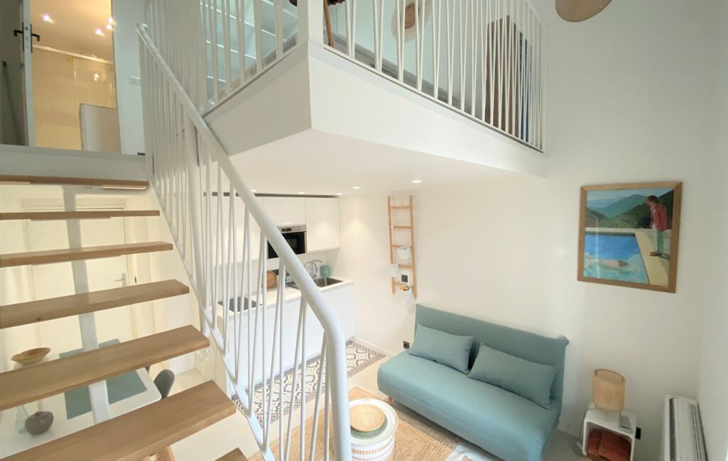 Composé au premier niveau d'un séjour avec cuisine équipée et en mezzanine d'un couchage double avec lit coffre, un grand placard aménagé et une salle de bains