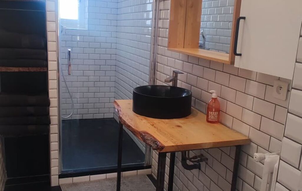 Salle de bains : Neuve avec douche, lavabo et WC.