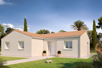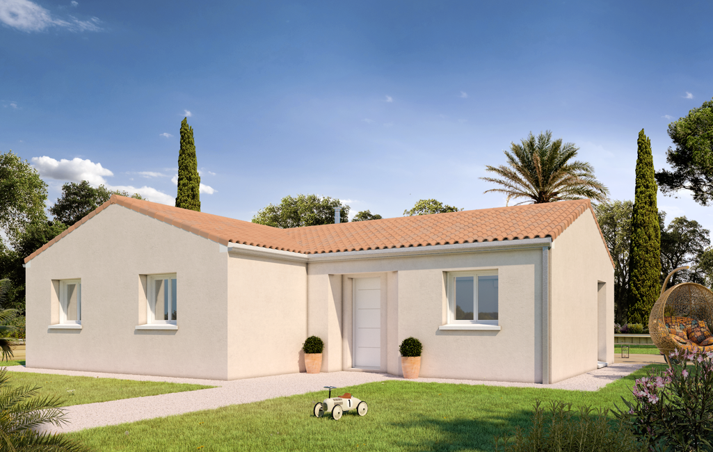 Exemple de réalisation pour le budget indiqué : Maison contemporaine de plain-pied aux normes RE2020 vous proposant : un séjour ouvert sur cuisine vous offrant une double expositions et un accès direct au jardin, 3 chambres avec placard dont une suite parentale avec douche et dressing.