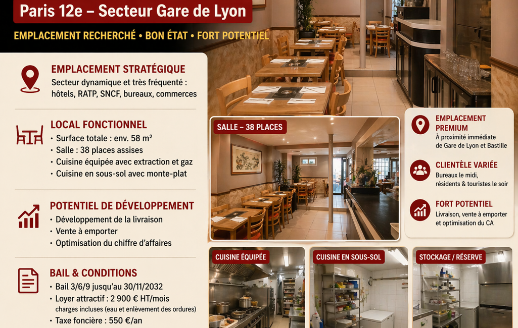 iad France - Pingping Liu vous propose: Restaurant – Emplacement recherché – Bon état – Paris 12e (secteur Gare de Lyon)