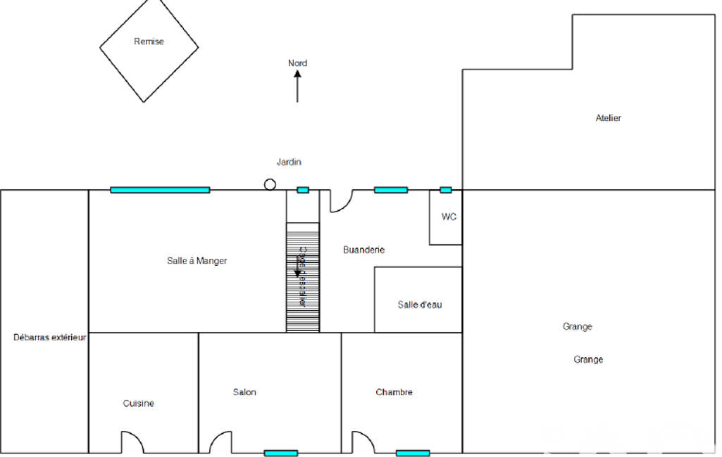 La maison permet une vie de plain-pied avec, en son rez-de-chaussée, une cuisine équipée de 15 m² avec insert à bois, une pièce de vie de 20 m², une buanderie avec WC et une première salle d’eau (avec cabine douche), ainsi qu’une chambre (ancien salon de coiffure) de 13,5 m² avec coin lavabo.