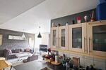 Il se compose d’une cuisine ouverte entièrement équipée (four, plaques électriques, hotte, lave-vaisselle, vaisselle) donnant sur un salon lumineux avec porte-fenêtre et balconnet.