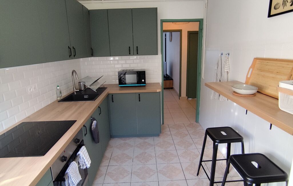 Vous profiterez en commun d'un grand salon séjour avec balcon, d'une cuisine aménagée équipée (plaques, hotte, four, frigo et lave-vaisselle) avec cellier, et d' 1 salle d'eau. Lave-linge à disposition.