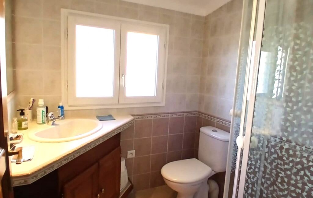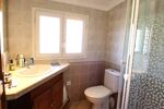 -1 Salle d'eau avec 1 douche cabine grand bac (90) en quart de cercle, 1 meuble en bois et faïence avec lavabo et grand miroir intégré, 1 WC, 1 fenêtre en bois en double vitrage opaque