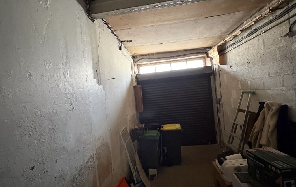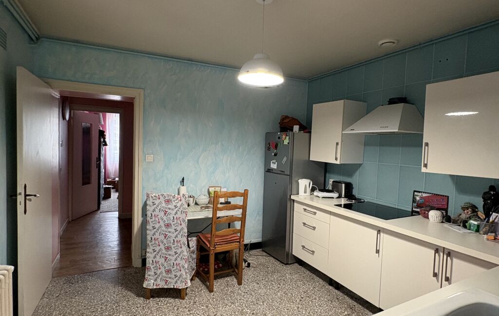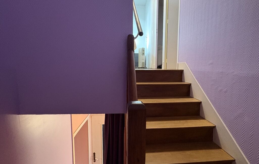 Un salon, situé au fond d’un petit couloir, offre un espace de vie agréable et chaleureux. Ce couloir mène également à l’entrée du garage ainsi qu’aux escaliers donnant accès à l’étage.